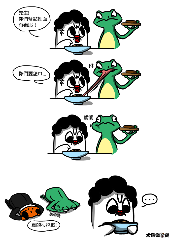 這隻面無表情、手長腳長的綠色青蛙,常因為說出來的話太直接,而被逮捕抓進警車。它的背景其實跟前段時間出現的「窮酸細菌君」類似,但盜哥表示,因為吉白蛙本身的個性就是「吉白」,這樣的設定讓他在想點子時容易許多。