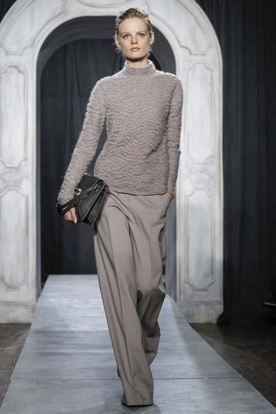 立體裁剪,時而緊身,時而寬鬆,透過輕薄雪紡刺繡俄國羔皮呈現華麗的風格,讓睡衣式的洋裝在夜裡優雅作祟。同樣的效果運用在剪羊毛材質上,厚實的皮革配上誇飾的毛皮,這部份要歸功於設計師對於誇張肩線的恣意揮灑(這是今年秋冬值得關注的關鍵輪廓),寬版流暢的長褲,展現陽剛蘊含柔美的戲劇效果,柔軟的服裝結構利用中性灰褐色和朦朧灰色呈現深度,這樣的效果在漸黑祖母綠和紫水晶寶石色布料上更加明顯。這一切都讓這魅力新品種如此摩登且精緻。