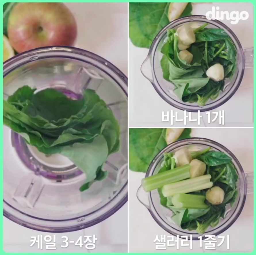 模特兒韓惠珍的蔬果汁食譜為,甘藍菜10葉、1/2顆蘋果、芹菜10cm 5支、檸檬1/2顆、生薑1/2個。