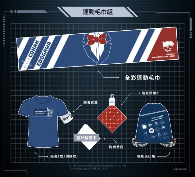 代表偵探方的「推理入門組」有基本的跑者手冊、跑者T恤、跑者臂章和機能束口袋等四樣品項,其中「機能束口袋」上面的設計元素更包含了毛利蘭、阿笠博士、灰原哀等人呢!