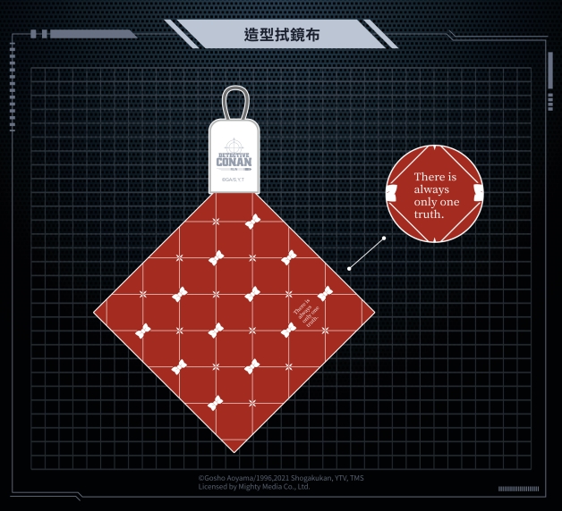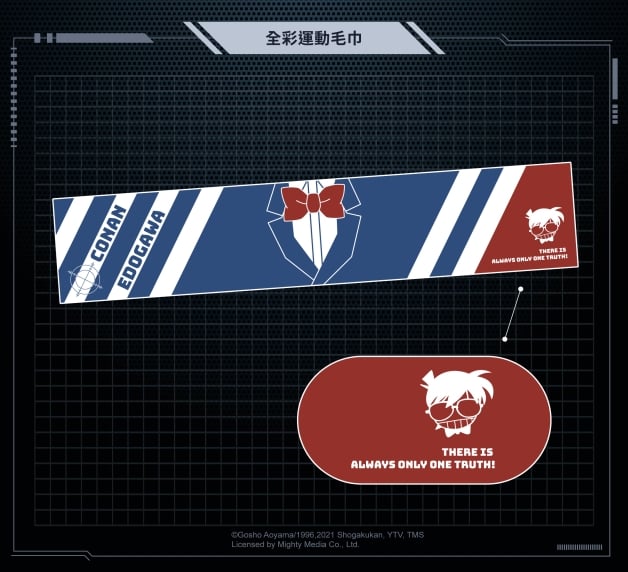 代表偵探方的「運動毛巾組」,除了推理入門組的四款之外,多加了「全彩運動毛巾」和「造型拭鏡布」,全彩運動毛巾就是柯南的衣著造型,經典的變身領結也不沒有少,右下角還有隱藏「真相只有一個」的名台詞!