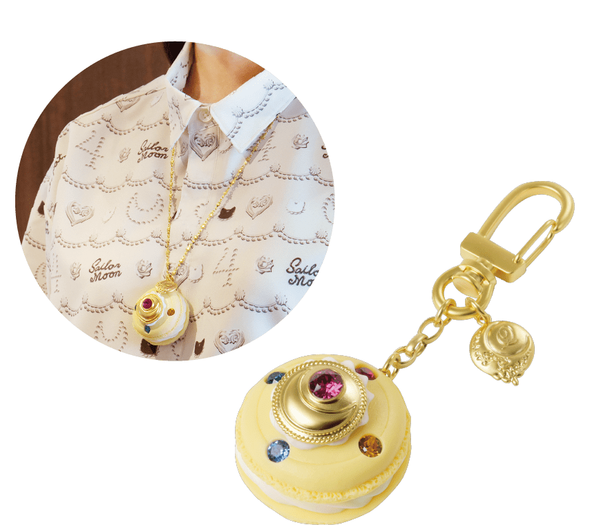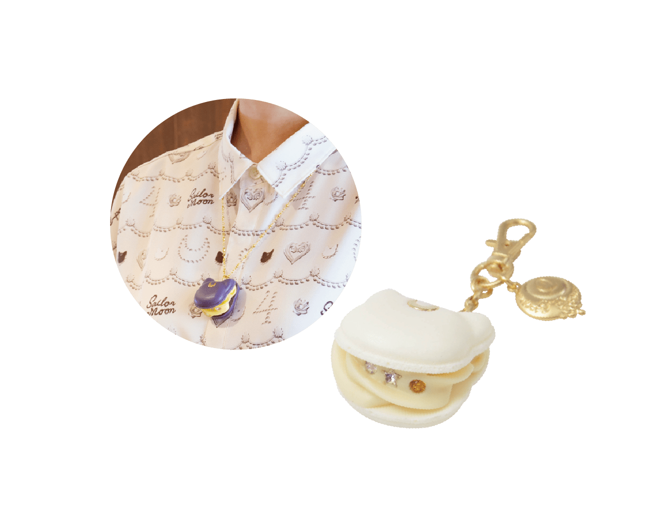 這次讓我們穿越回《美少女戰士》動畫初代,經典變身器化身一顆馬卡龍了!鑲嵌寶石的金色變身器胸針,變成擁有滿滿奶油內餡的可口馬卡龍項鍊、吊飾,鏈條處更點綴金色星星裝飾,一戴就想喊出:「月亮三稜鏡力量,變身!」(笑)