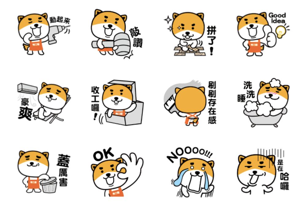 本週同樣有貓也有狗,特力屋限定貼圖以萌萌的小狗為主角,收錄動起來、拼了、收工、等日常用語,還有時下流行語「是在哈囉」,共有16張貼圖可以使用,推薦給狗奴們!