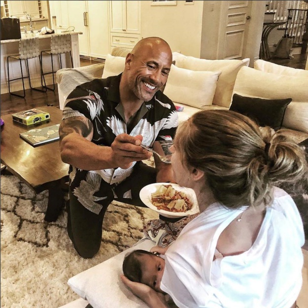 好萊塢男星巨石強森在大銀幕上「硬漢」形象深植人心,但是下戲後他也是溫柔顧家的好男人,常常可以看到他在社群上分享女兒和女友的照片,其中有一張他餵哺乳中的女友蘿倫吃飯的照片,就獲得不少共鳴,他寫道:「媽媽雙手都忙著哺餵女兒,所以我負責餵媽媽吃晚餐,我的榮幸!」