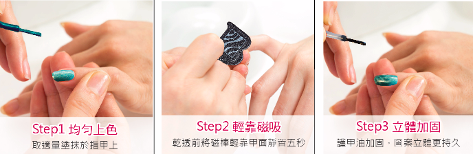 Miss BOBO水性可剝磁力指彩均勻搖晃使磁粉均勻後,取適量塗抹於指甲上。在指彩乾透前,迅速將磁力棒頂端圓弧處輕靠在第一指,靜置3~5秒後移開,圖案即刻浮現,最後可以擦護甲油加固!