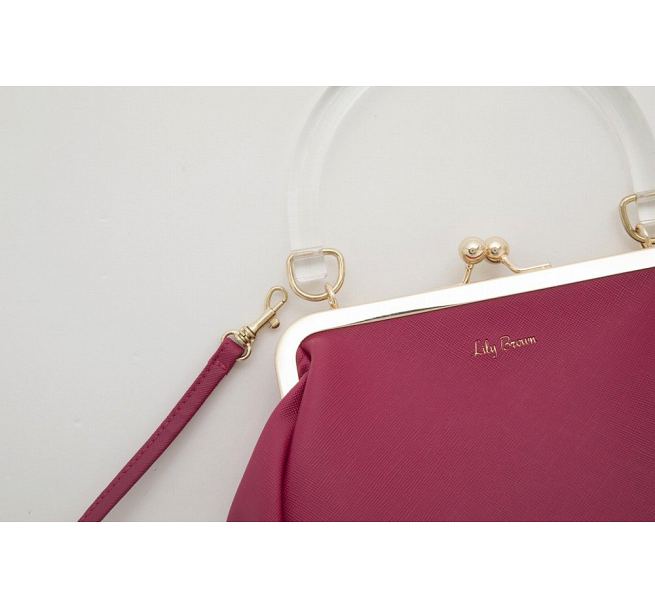 結合復古及現代流行元素的日系時尚品牌「Lily Brown」,此次特別設計了這款粉色金邊兩用口金包,不僅可以加裝揹帶斜背、也可以拿掉揹帶手提,兩種用法都非常可愛;手提把的部份,特地使用了透明的壓克力材質,讓整體看起來更俐落有型,包包後方還有一個置物口袋,可放票卡、手機,拿取小物超方便!
