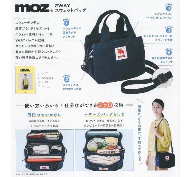 來自瑞典的北歐雜貨品牌「moz」,這次隨刊附贈經典Logo的肩背手提兩用包,多夾層的設計,以及耐髒的海軍藍布料,兼具實用性與時尚性。尤其是可調長度的肩背帶,任何身高及體型都非常適合喔!