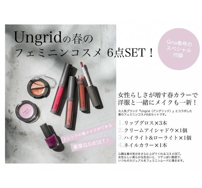 春季號的《Gina》除了詳盡地頗析了今年春天的最新流行,還附贈Ungrid春季彩妝6件組,裡頭包含了淺茶色、裸色、玫瑰紅的唇蜜各一支、一深一淺的雙色打亮膏、奶油質地的珍珠粉眼影、以及薰衣草紫紅的指甲油一瓶;如此划算的組合,不買真的會捶心肝!