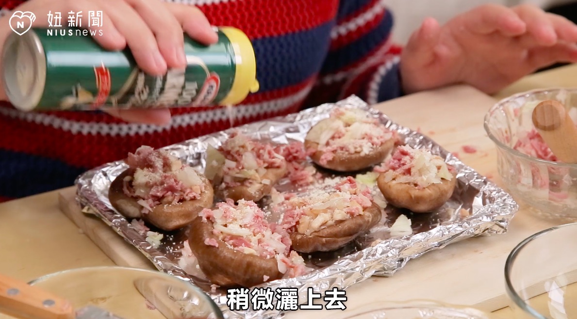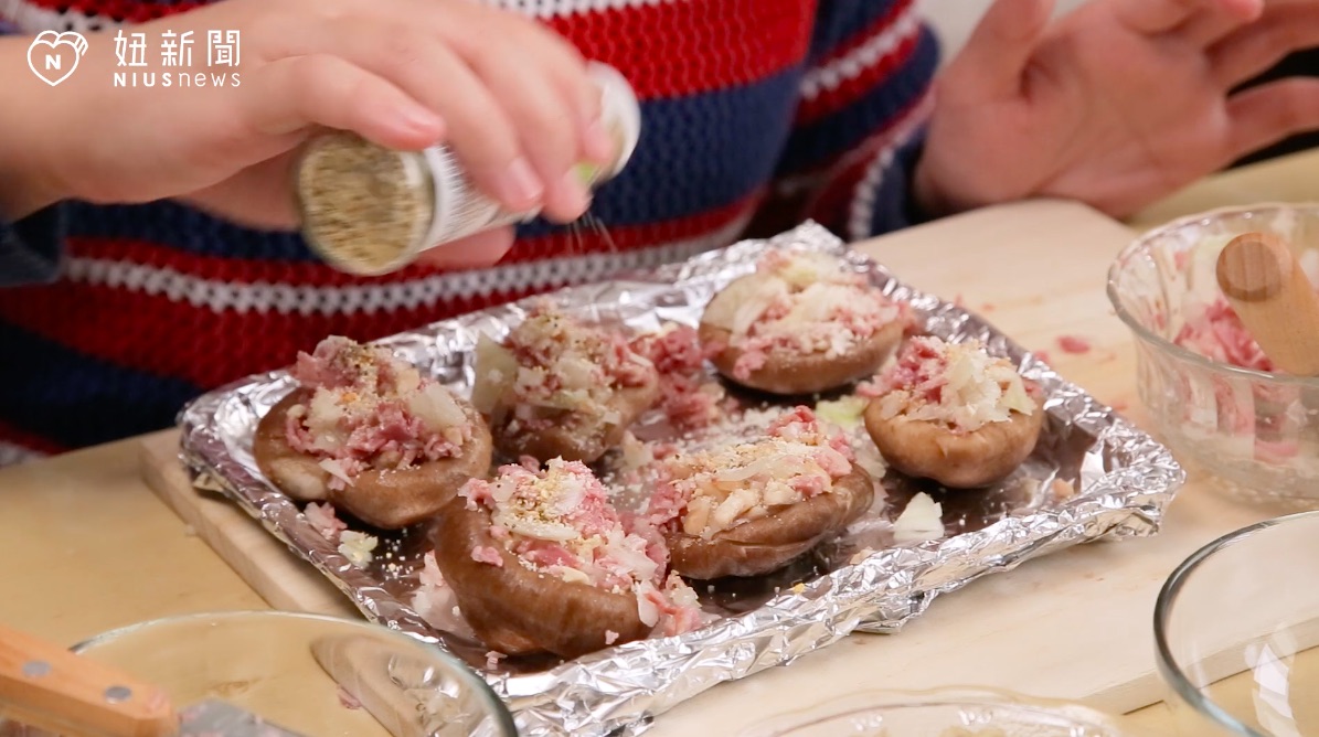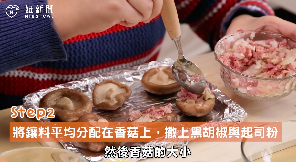 STEP2:將鑲料平均分散在香菇上,再撒上起司粉和黑胡椒