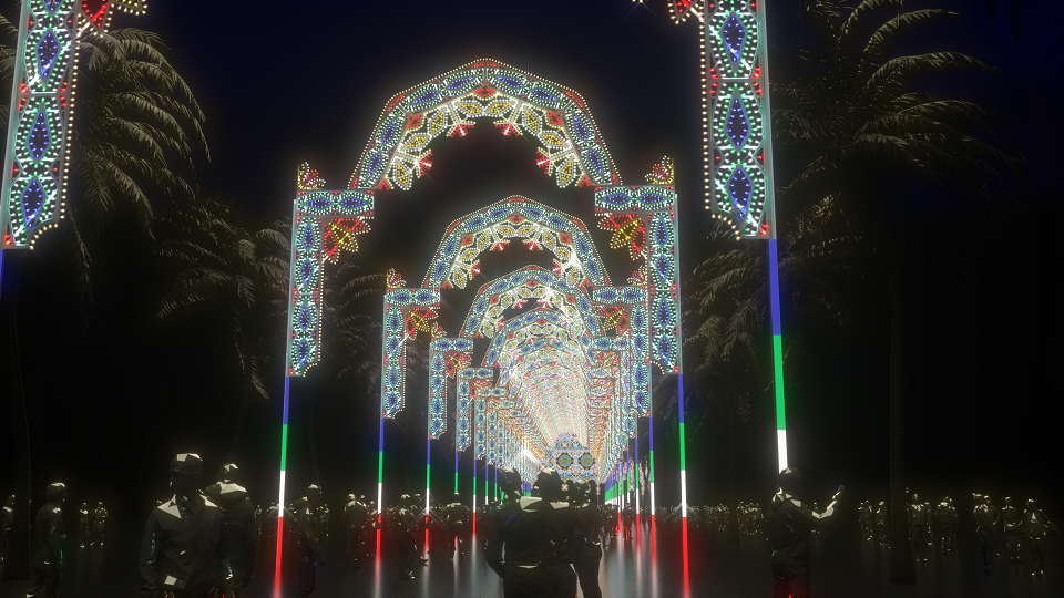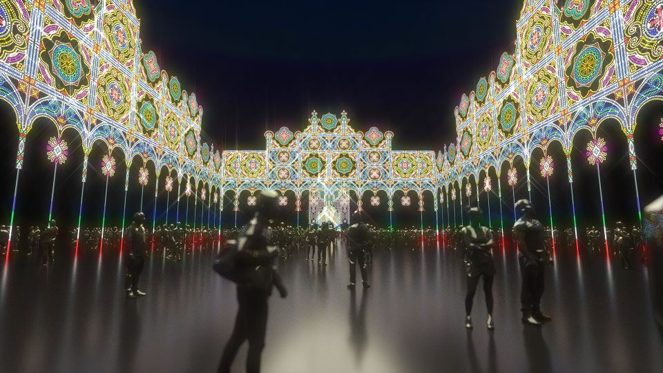 這回的「2019台北光之饗宴」由神戶燈節的同一位義大利設計師所負責,此次展場分成3個區域,「Galleria」位於仁愛路四段,由4至20多公尺不同間隔的21個拱門,打造全長311公尺的光雕隧道,拱門的設計發想是台灣山峰,上面還有半顆的圓形設計,象徵自山峰中緩緩升起的朝陽和太陽光芒之意;接著「Façade」是設置在仁愛路四段逸仙路口的大型建築物,高達22公尺,呈現出華麗壯觀的氛圍。