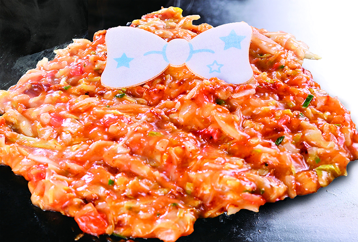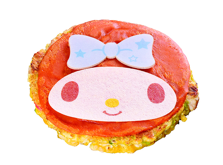加入麻糬和起司的大阪燒上頭,放上由番茄醬攪拌成的粉紅色餅皮(這顏色...有點血腥啊),最後裝飾蝴蝶結最中餅跟五官,美樂蒂大阪燒就完成囉!