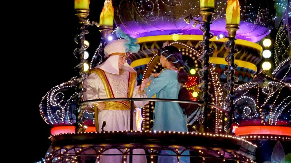 夜間遊行則是能看到站在絢麗電子花車上的迪士尼電影《阿拉丁》主角、迪士尼‧皮克斯電影《玩具總動員》等角色們,兩個遊行能看到不同的角色,推薦各位都觀看!(倘若身上有貼紙,遊行時角色若看到,也會與你打招呼哦!)