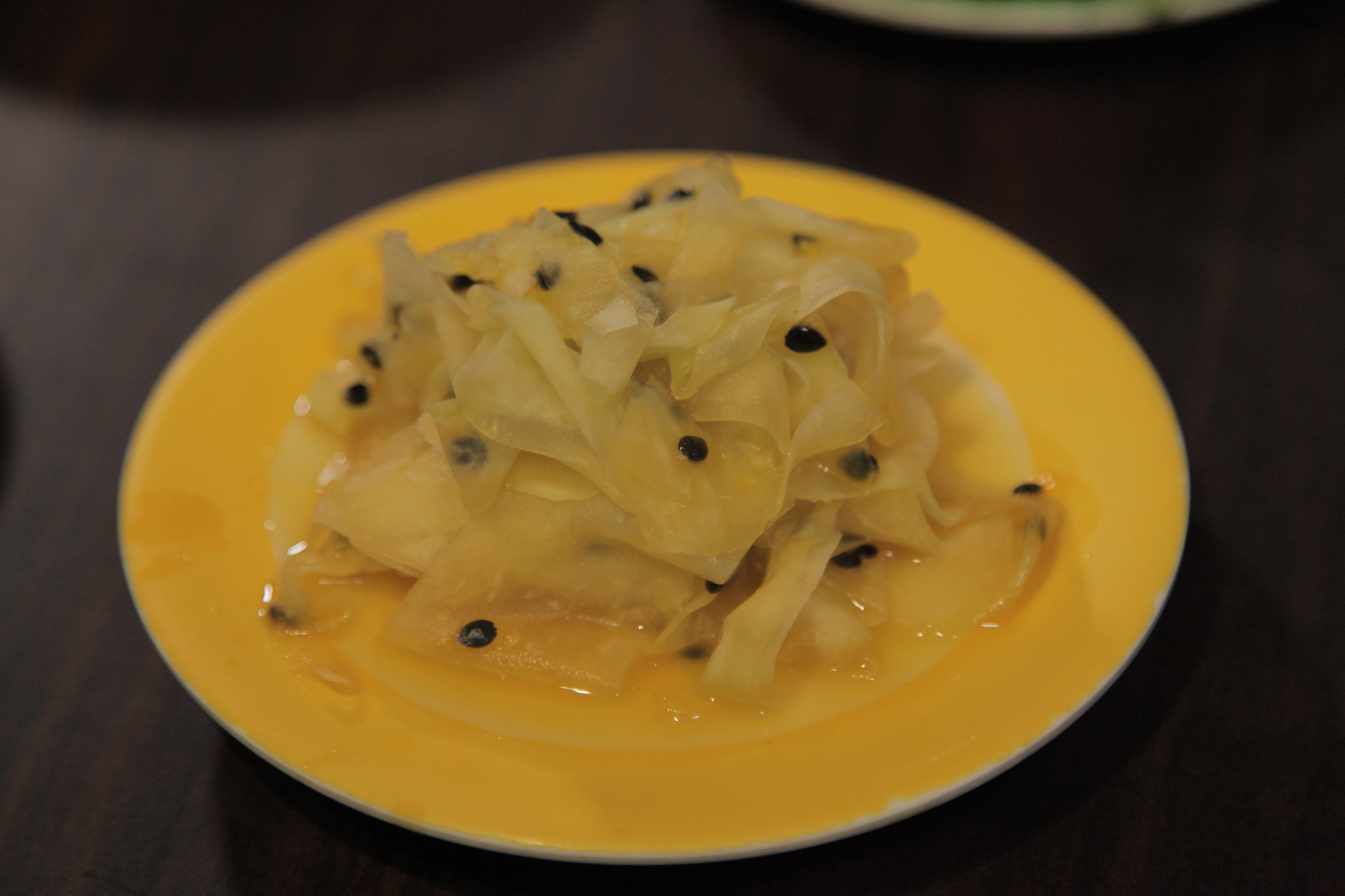別看青木瓜被片得很薄,其實吃起來相當脆口 !搭配上酸甜的百香果醬,真的很開胃!