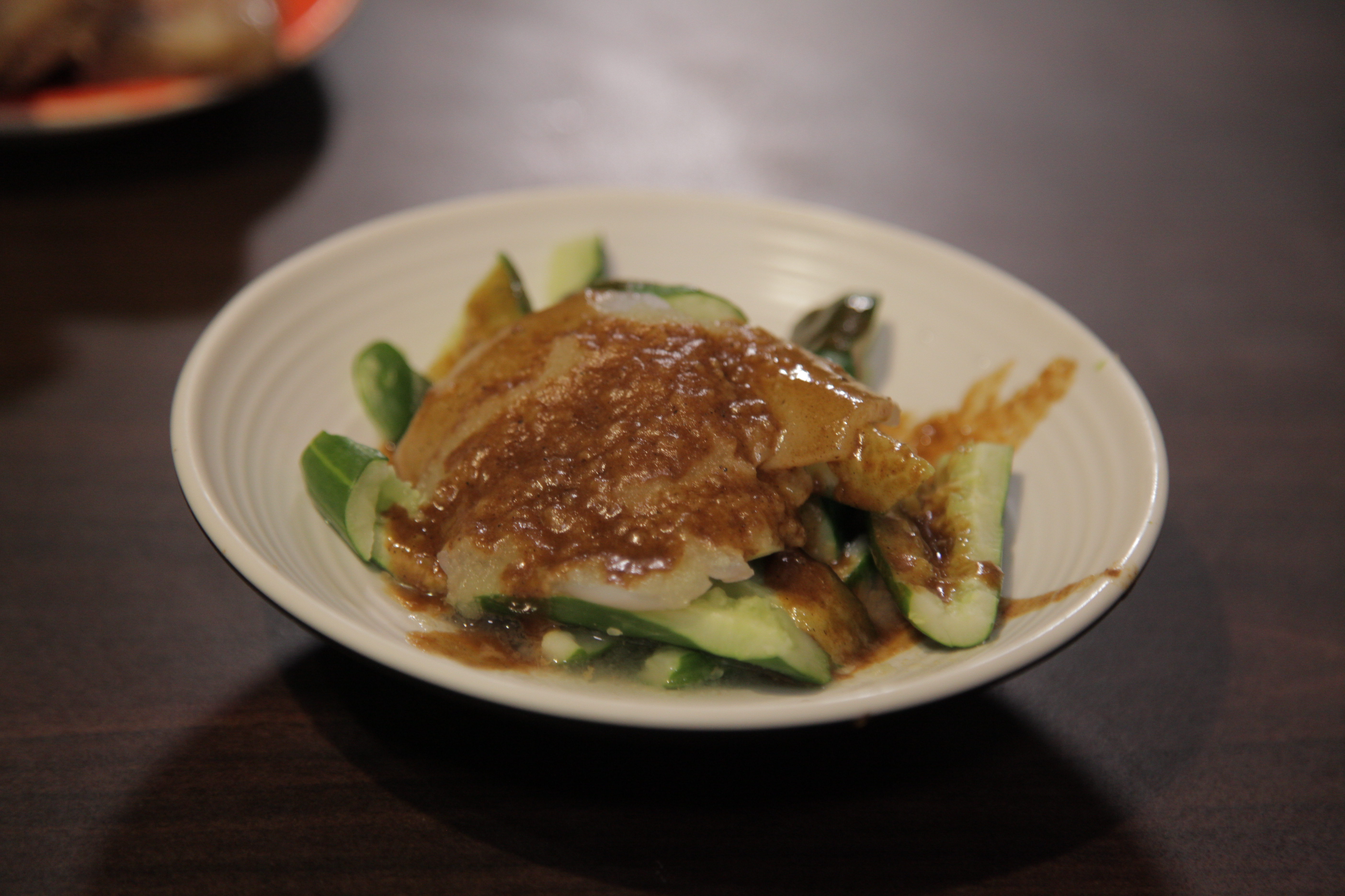 粉皮的滑嫩與清脆的小黃瓜讓這道小菜吃起來有種「小清新」的感覺(XD),雖然麻醬看起來似乎有點鹹,但小黃瓜的清甜中和掉了麻醬的濃郁,讓整體的味道鹹而不膩。