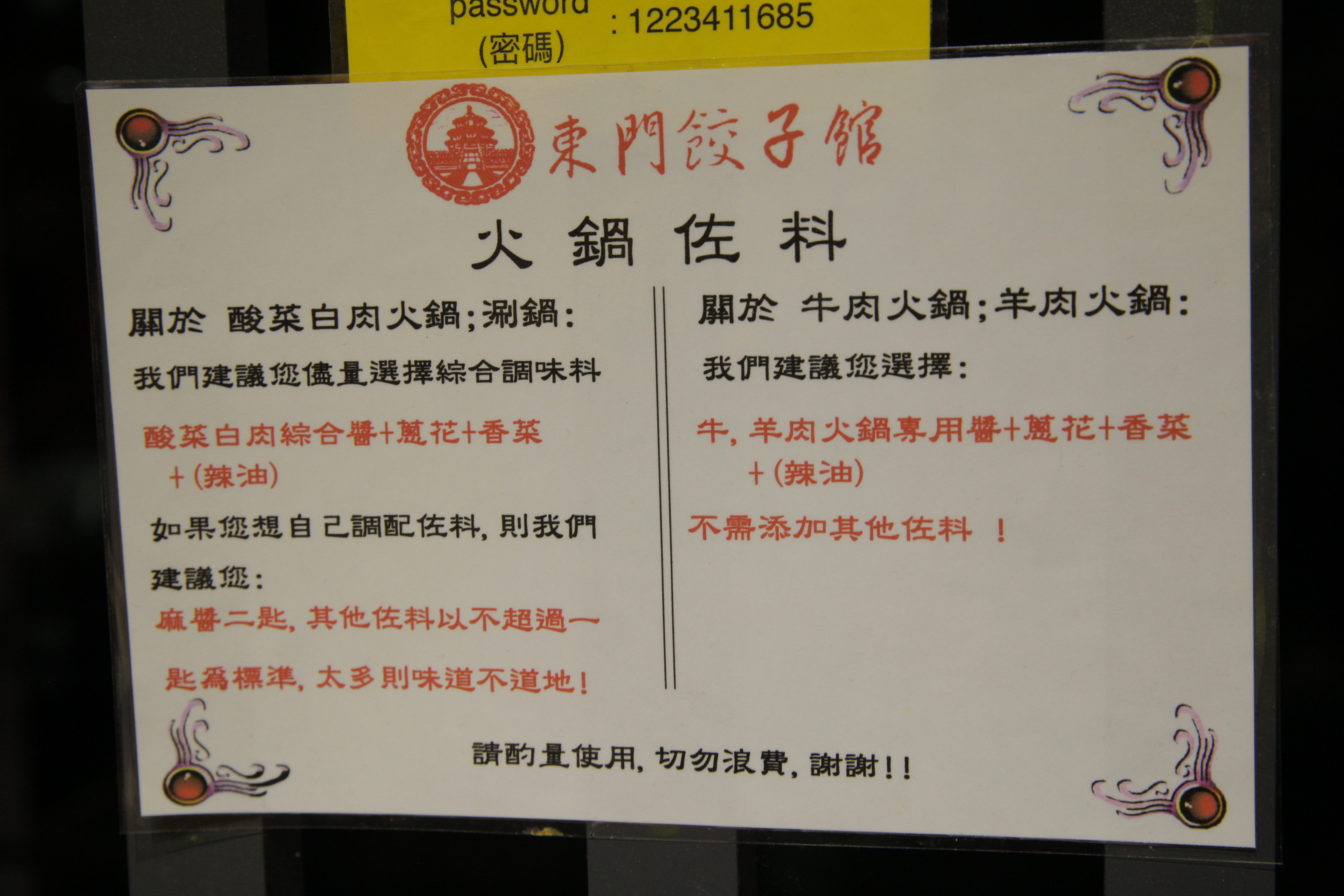 介紹完餃子與小菜之後,重頭戲就是「酸菜白肉鍋」啦!不過在請它出場之前,要先介紹一下這邊特別的火鍋沾醬。東門餃子館很貼心,在醬料區還貼上了建議顧客調配的醬料,如果沒有想法的人可以照著上面的說明做調配。