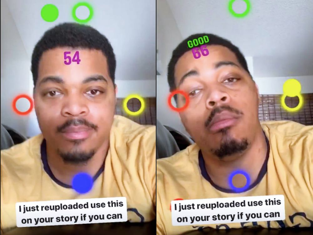 第三款濾鏡是用臉玩的節奏遊戲,玩法很簡單,只要順著節奏,在顏色圓點與框框相交之時,讓臉碰到對應的位置就能成功消除它。不過圓點點會越來越多,是款相當可驗反應能力的遊戲。