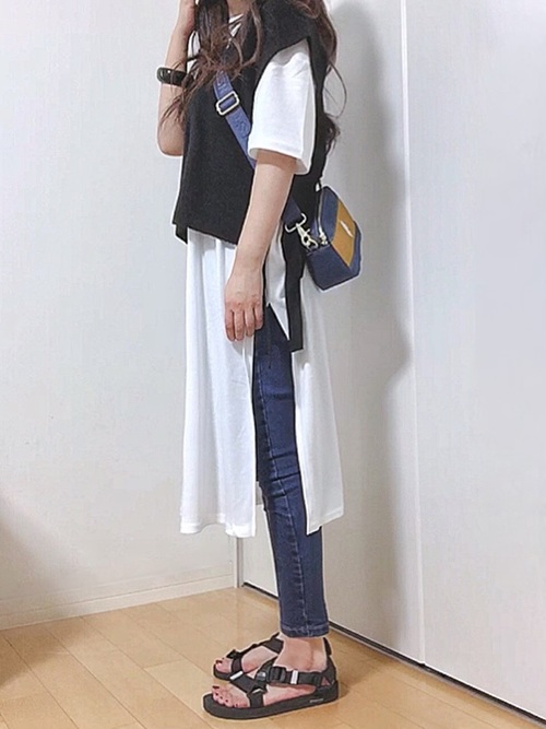 長版的側開岔T恤單穿怕看起來太簡單的話,除了搭配長版襯衫之外,也可以像這位妞妞一樣利用短版背心來增加層次感。