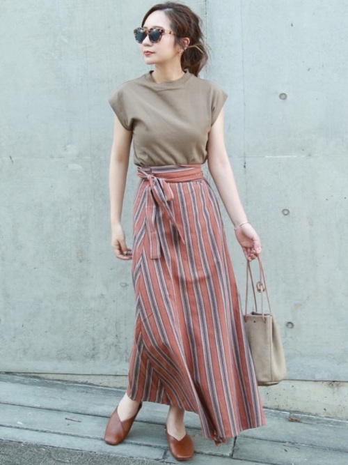 綁帶是今年非常流行的元素,想要充滿夏日風情,就可以挑選橘色等鮮豔的色彩。直條紋的設計可以修飾身型。為了不搶走裙子的風采,上半身建議搭配裸色或黑白色系即可。