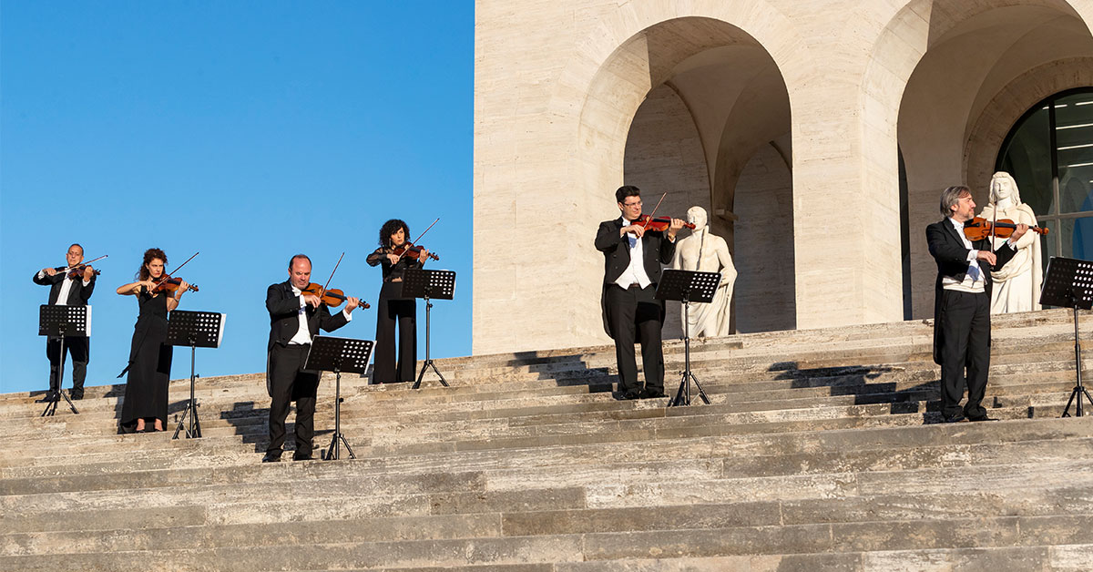 從黎明時分在 Palazzo della Civiltà Italiana 台階上演奏的第一樂章開始,接著來到拱門下維持著因應最近幾週事件所規定出的社交距離,音樂家們最終將在日落時分重新聚集在 Palazzo della Civiltà Italiana 的屋頂上,為《夏》的最後樂章進行調音,在過去幾個月因疫情而被迫隔離之後,再度重聚演奏,共同歌頌音樂與夏日的暖意。