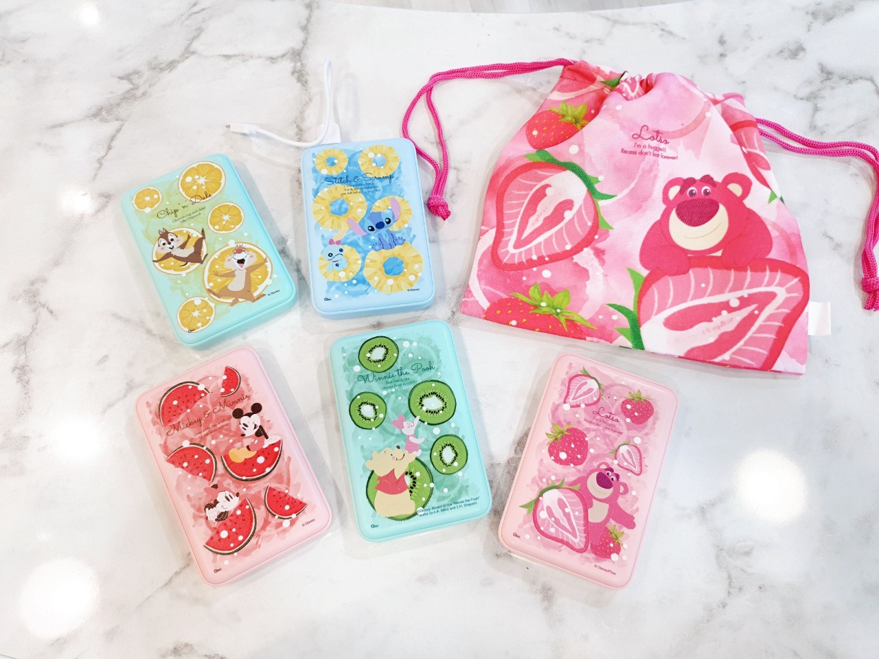迪士尼的卡通人物們結合了夏日水果,打造了超可愛的行動電源,讓妞妞們充電時都能散發出可愛的粉紅泡泡,圖案包括米奇米妮、奇奇蒂蒂、史迪奇、熊抱哥以及維尼小豬共5種款式,一顆的電容量有6000mAh,帶出門絕對足夠。
