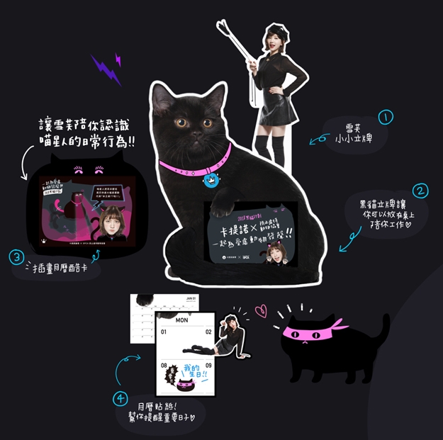 以超狂作風廣受網友喜愛的卡提諾論壇,投入公益也不落人後,今年找來SPCA(防止虐待動物協會)聯手推出【黑貓計畫】活動,一同販賣公益年曆,為流浪、受虐動物發聲。更請來好久不見的甜心女神郭雪芙擔任活動大使,以一身半透明黑色薄紗、大露「絕對領域」的造型,化身最美貓女指揮官。而郭雪芙在得知這次年曆竟是設計成和她1:1等身的人形立牌時十分驚豔,立即興奮對粉絲大喊:「快把我帶回家!」霸氣宣言,就是希望能快速募得款項,一起挺公益。