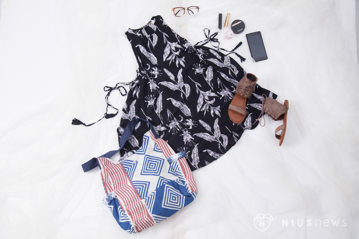 如果女孩們的身高比較矮小一點的話,可以選擇one piece的洋裝作為穿搭重點,利用側邊有綁帶的小心機,搭配簡約的棕梠葉黑白印花圖案,讓衣服多了點性感氛圍呢!(另一半立刻大喊受不了~~)如果想要整體再多一點可愛的感覺,可以搭配一款色澤鮮豔的包包,讓穿搭不會太過呆板喔!
