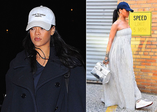 常穿運動風的蕾哈娜,也會選擇戴軟質的老爸帽,無論長洋裝或正式感的大衣,都能看到老爸帽的蹤跡。