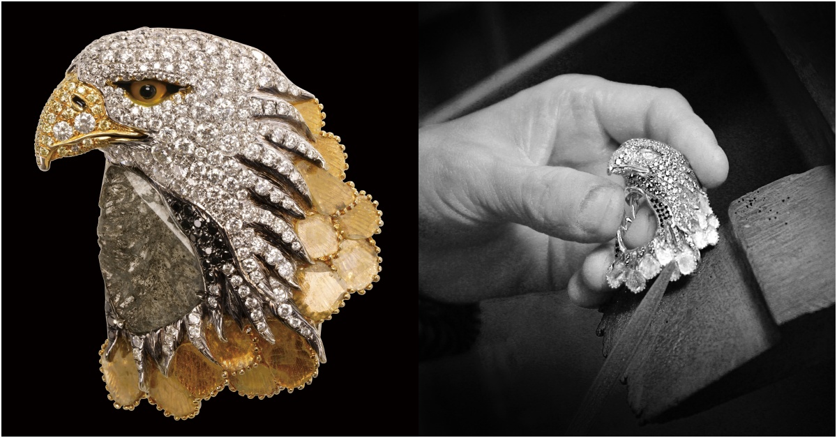 自然界強者的霸氣與威嚴樣貌成為JHENG雕琢主軸,搭配獨有鑽片工法的獨創性,王者風範系列作品的問世宛若蓄勢待發的獅王,初登場就成為全場目光的焦點。象徵華麗高貴的金黃色鬃毛,妝點沙佛萊石點亮獅王深邃目光,如此傳韻的經典作品,飽含了JHENG對自然萬物的讚許與王者形體神韻的精準刻畫,完美程度令人屏息。