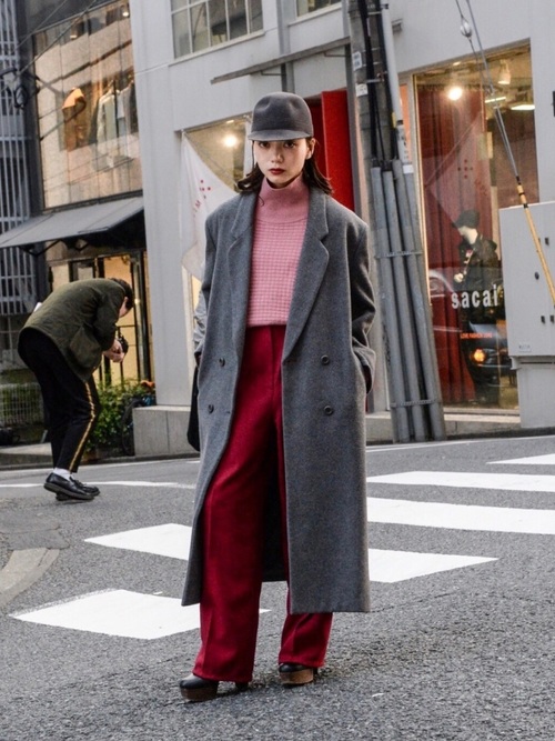 粉紅色毛衣搭配紅色寬褲的同色系穿搭,外罩上深灰色大衣,整體視覺上非常協調又時髦。