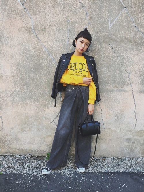 鮮明的黃色調搭配上黑色系丹寧褲與皮外套,讓個性的姿態注入亮眼的魅力。