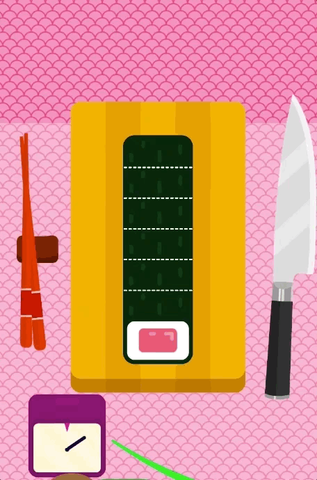壽司上的虛線就是你需要切下的的刀數,只要點按螢幕就能開始切壽司啦!要記得得在深粉色填滿背景之前處理完食材,不然就會瞬間結束遊戲哦~(認真是瞬間)