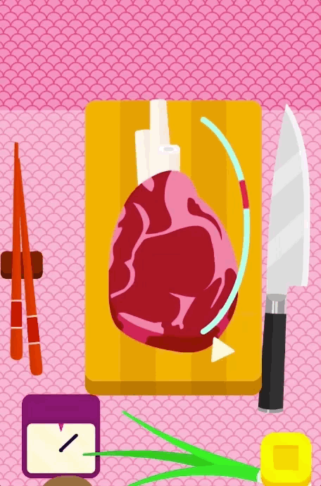 生牛肉的處理方法則是必須在箭頭抵達紅色區塊的那一刻按下螢幕。