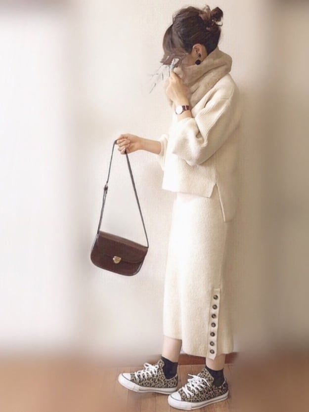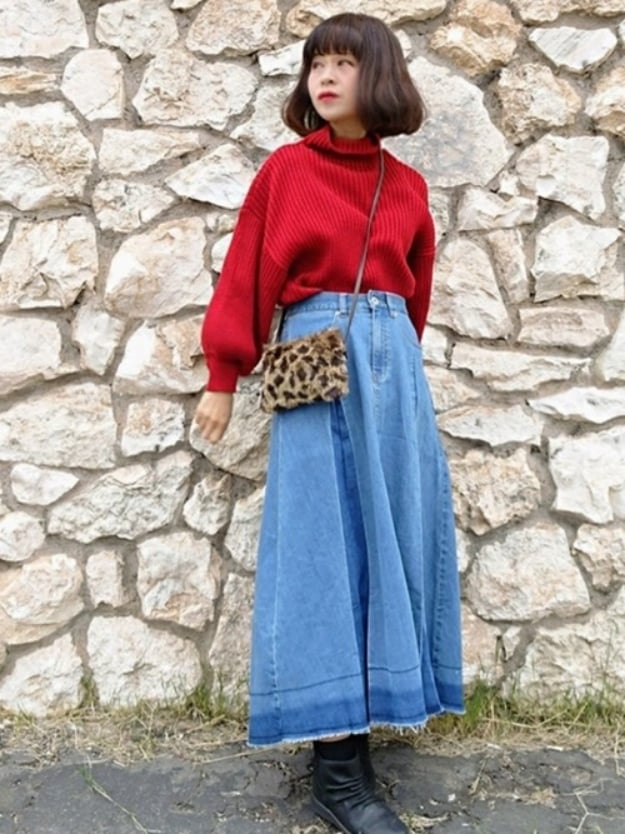其實紅色算是很難駕馭的顏色,連妞編輯都不太敢嘗試~但是這位妞妞用紅色高領毛衣×牛仔長裙×豹紋小包的搭配很可以~