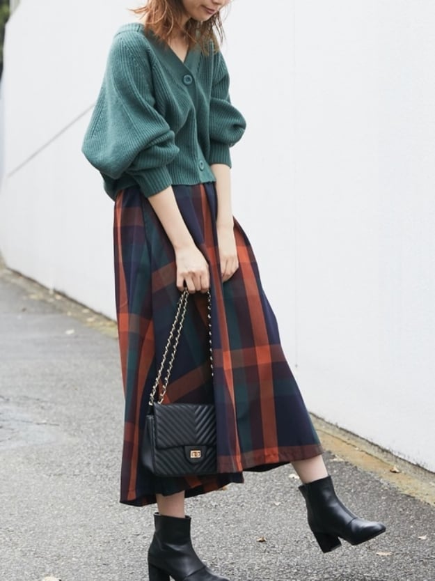 今年很流行把針織短版外套當作上衣穿,特別的藍綠色搭配格紋長裙整個人看起來有氣質又很時髦,可以再搭配球鞋展現休閒感,也可以穿上粗跟黑皮靴~