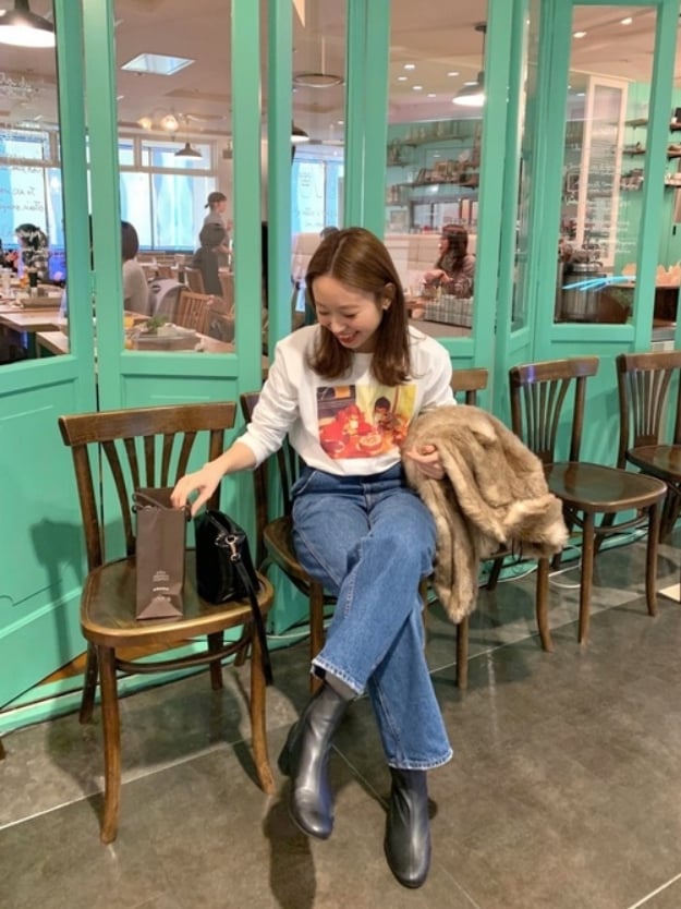 直筒牛仔褲最近又開始火紅,這位妞妞配上白色印花上衣和黑皮靴,毛毛外套則是這次裝扮的重點,就算這樣簡單穿也還是很好看。
