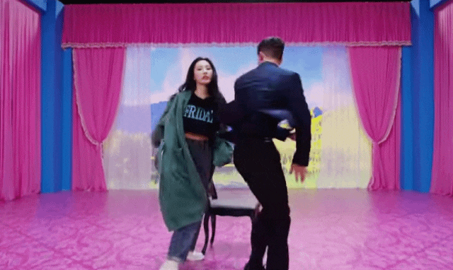 整支MV裡最休閒的穿搭出爐!與男舞者雙人舞的時候,善美以露腰短T、綠色針織外加上丹寧褲登場!有著FRIDAY的字樣的俐落上衣來自於義大利品牌「Alberta Ferretti」,人人都可以複製的外出穿搭!