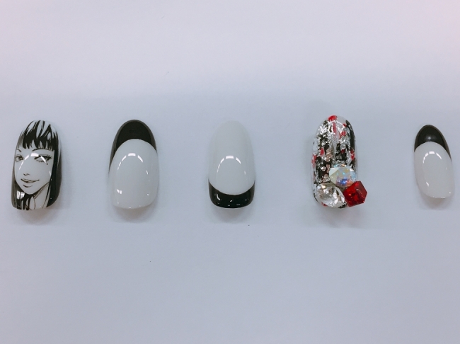 2018年時伊藤潤二首部動畫化作品亮相,在如此值得紀念的一刻,官方也展開了一系列的新合作。他們和日本秋葉原的美甲沙龍「Venus Rico」聯名,推出了一系列以漫畫改編動畫《伊藤潤二驚選集》為主題的指彩,分別是「美女富江」、「淵」跟「十字路口的美少年」,每組還原度都超高,讓人嚇到都不敢吃手手了啦!