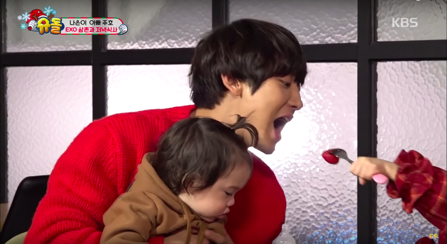 到了溫馨的吃飯時間,KAI這時提問:「爸爸跟叔叔們誰最帥?」娜恩毫不猶豫回答「爸爸」(爸爸表示欣慰),燦烈及KAI只好繼續競爭第二名,最終娜恩選擇了KAI,並且餵了一顆草莓,落選的燦烈掩飾不住失落(?)馬上也要求「草莓餵食」,沒想到娜恩開始大玩「推拉大法」,怎樣都不把草莓送進燦烈口中,甚至還只餵叉子(笑哭),讓燦烈大崩潰!(最後千辛萬苦終於吃到XD)