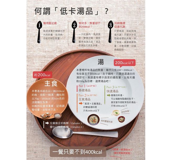 不只有湯而已,從瘦身湯、燉煮常備菜、低卡飯料理、低醣湯麵、到燜燒杯便當通通列出詳細料理法、卡路里以及蔬菜公克數,甚至還祭出適合全家圍爐的「低卡火鍋」!