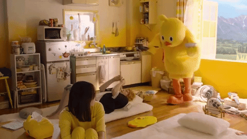 先來個前情提要,卸下國民老婆身份的新垣結衣,在廣告中變成超級懶散的宅女,連做吃的都好懶,睡在旁邊的小雞更是直接懶到融化,這個時候就要派泡麵出場啦!