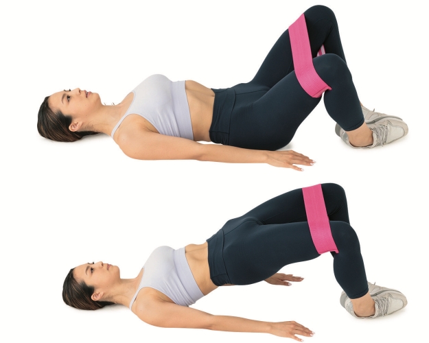 接下來進入初階動作的尾聲,橋式抬臀的關鍵在於雖然仰躺地面看似穩固,但其實更重核心的穩定,將身體躺下後彎曲膝蓋、併攏腳掌,盡可能地把膝蓋打開,將臀部肌肉收緊後抬臀,停留大約兩秒後即可回到仰躺姿勢。