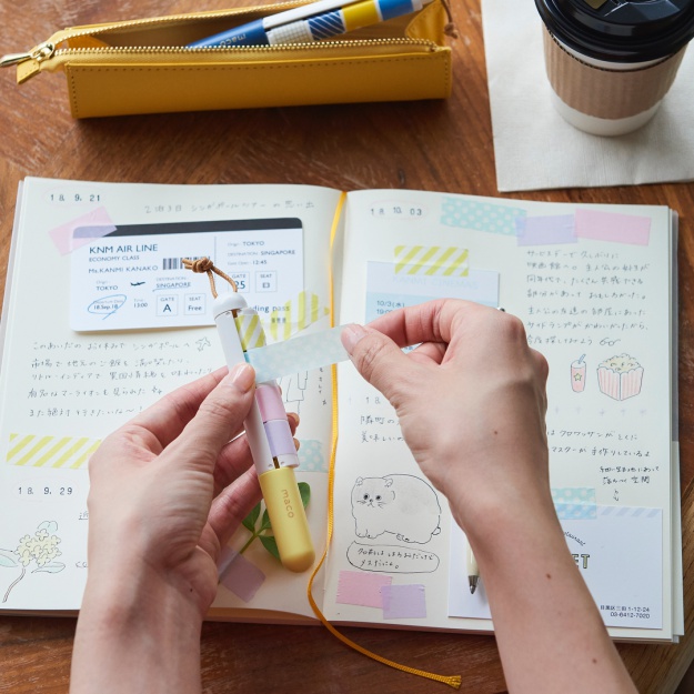 除了作為一支筆(?)收納在筆袋中,還可以利用筆身上的掛繩,把它當成吊飾帶出門,在攜帶上真的超級方便,各位說是不是呢?!目前這款紙膠帶隨身筆已經在日本上市囉!顏色總共有黃、粉、淺藍、深藍四種顏色可以選擇,最近要去日本玩的文具控們可以留意一下囉!(也期待之後這款紙膠帶筆會在台灣銷售♡)