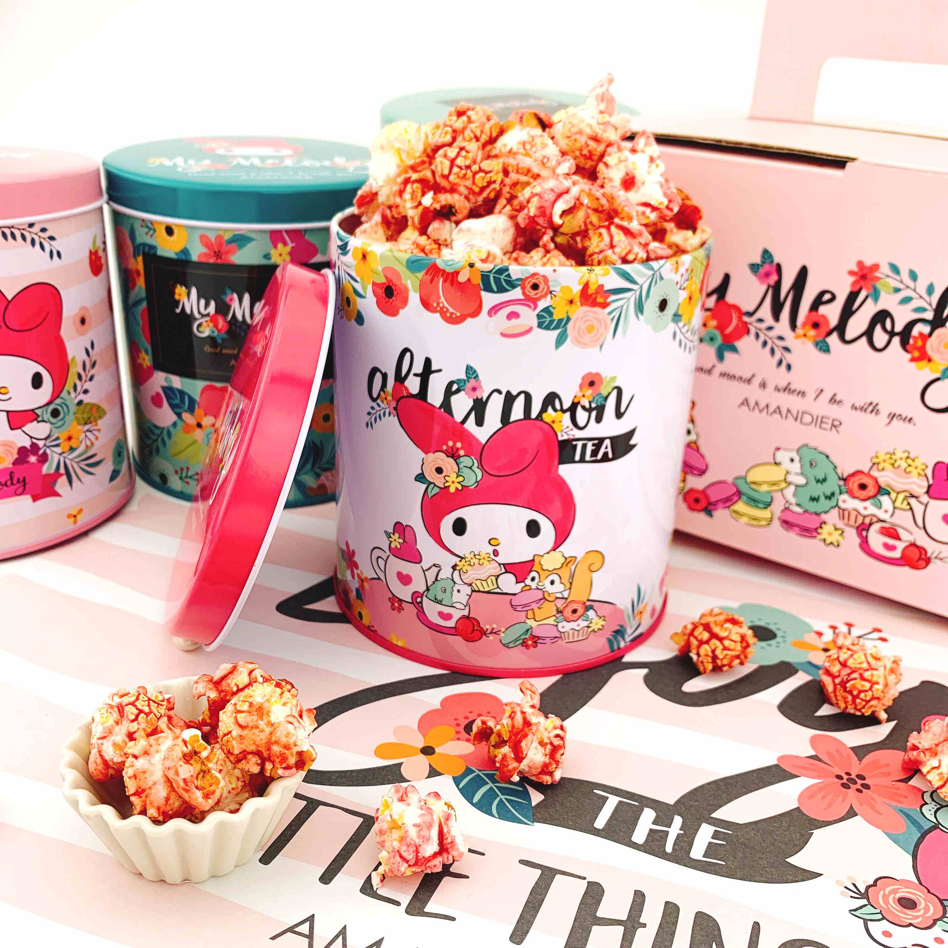 「美樂蒂期間限定花草風爆米花罐」單罐$160、雙罐組$310、全罐套組$599