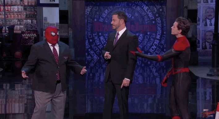 其實這不是荷蘭弟第一次上Jimmy Kimmel的節目搞笑宣傳了,早在《蜘蛛人:返校日》(Spider-Man:Homecoming)時也大陣仗的跟上百名穿著蜘蛛裝的臨演走上街頭(當然也有Guillermo)