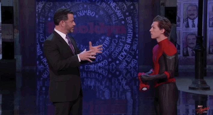 主持人Jimmy Kimmel不解的說自己是蜘蛛人的粉絲,但既然蜘蛛人有危險感測怎麼會這麼輕易被偷走面罩?荷蘭弟表示:「感測器是針對威脅感測,但Guillermo明顯看來不是好嗎!」(搭配一臉無奈哈哈哈哈哈哈哈哈)