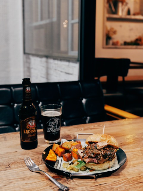 Q彈漢堡麵包,夾入綿密鵝肝醬和滿滿法式蕈菇醬,使用熟度剛好的牛排,而不是漢堡排,配上店家嚴選精釀啤酒,奢華滋味充滿大人風