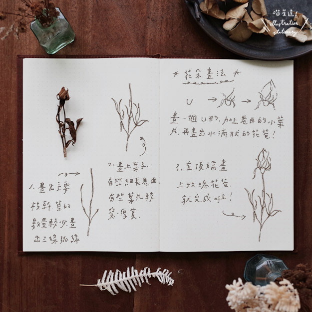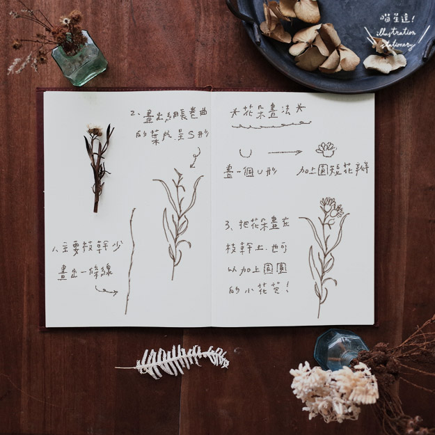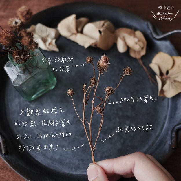 先觀察乾燥花的型態、花瓣和葉片的大小,再把他們的特徵畫出來。可以看到這束乾燥花的枝幹較細長分散,葉片細碎,花朵呈尖刺的放射狀。