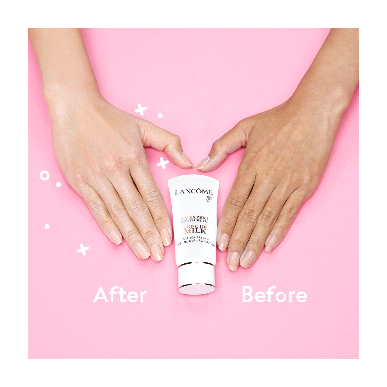 蘭蔻突破防曬極限,創造一款能立即為肌膚注入細緻自然光感的「超輕盈UV提亮素顏霜」,結合防曬、提亮雙功能,除了在無油配方中注入經典「玫瑰水精萃」展現清爽保濕。「3D專利隔離科技」能有效阻隔紫外線;全新添加「晶亮煥采因子」,在肌膚表層延展成一道美麗光暈,立即提亮掃黃,後續底妝用量更少、妝感更薄透。
