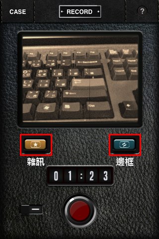 往上看還有兩個按鈕,黃色的是控制「雜訊」的添加,我個人通常都會使用,總覺得有雜訊看起來比較有8釐米的味道嘛!而右邊的綠色按鈕則是有一些「邊框」可供選擇。除了上面看到的一般邊框外,還有微微的黑邊、漸層的暗角,以及橘色遮罩等等。