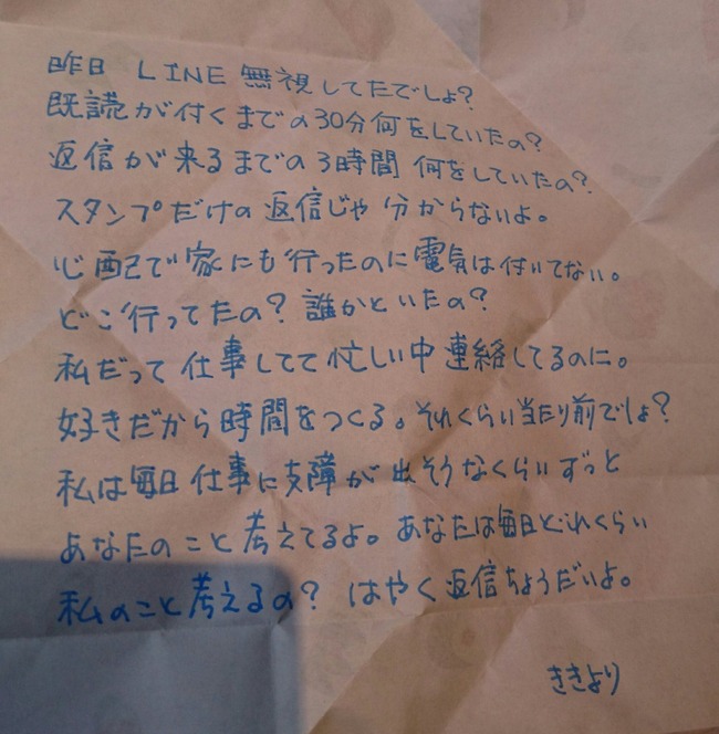 「為什麼過那麼久才回我訊息呢?還已讀不回,是在做什麼?因為太擔心還跑到對方家樓下,發現沒人在家而感到不安。最後還要抱怨一下,人家都花那麼多時間想你,想到工作都要出錯了,你到底有沒有想我啊?快點回覆我!」